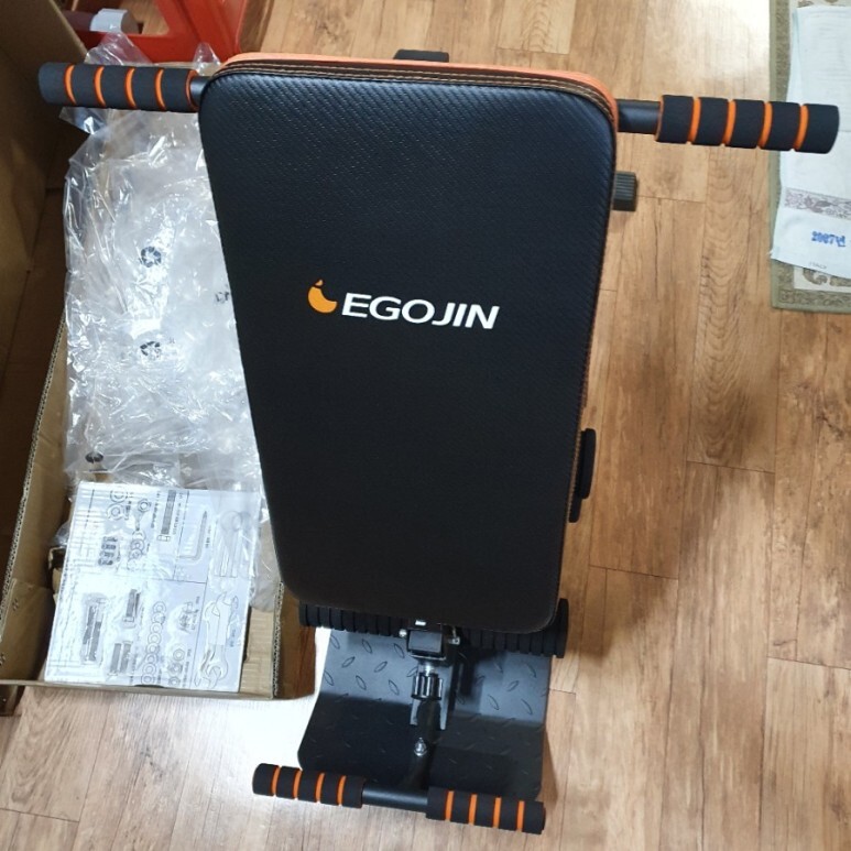 조립 끝. 벤치 형태로 조립이 끝난 모습입니다. 윗몸일으키기(싯업)을 기본으로 할 수 있는 모습. 벤치 형태로 할 수 있는 다양한 운동도 소화할 수 있습니다.