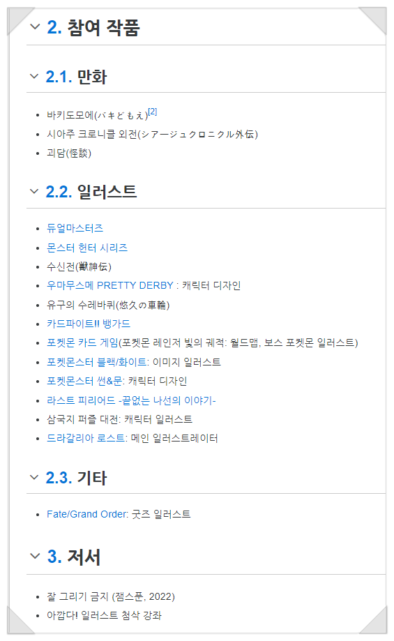 만화 “바키”는 일본 코믹스를 좋아하는 분들이라면 대부분 알법한 유명한 작품이죠. 그 만화의 채색과 게임 드라갈리아 로스트의 메인 일러스트레이터, 포켓몬스터 공인 일러스트레이터 등으로 활동했다고 하니 오랫동안 잔뼈가 굵은 아티스트임이 분명한 것 같습니다. 나무위키를 보니 자세한 참여 작품을 알 수 있었습니다.