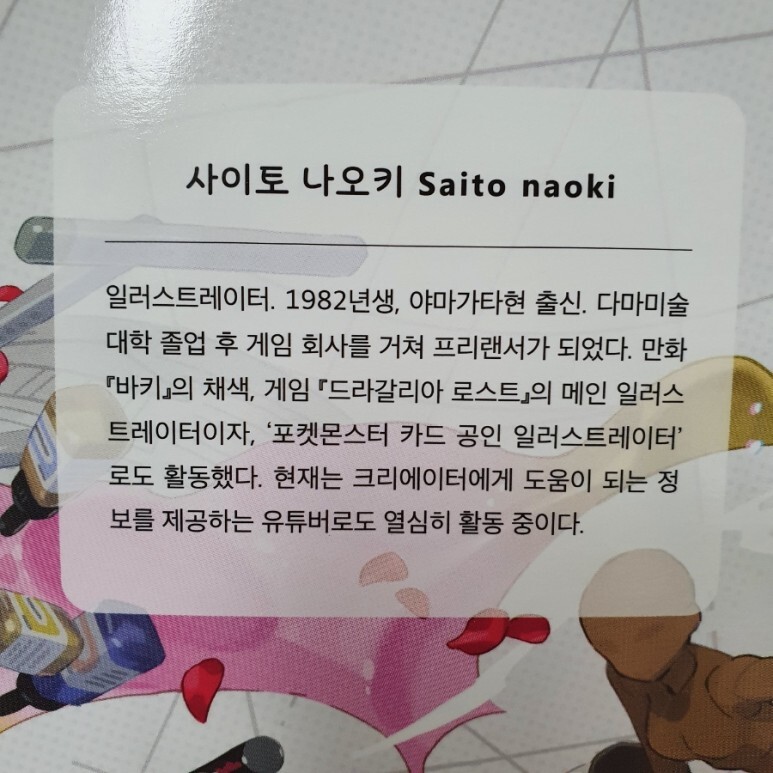 만화 “바키”는 일본 코믹스를 좋아하는 분들이라면 대부분 알법한 유명한 작품이죠. 그 만화의 채색과 게임 드라갈리아 로스트의 메인 일러스트레이터, 포켓몬스터 공인 일러스트레이터 등으로 활동했다고 하니 오랫동안 잔뼈가 굵은 아티스트임이 분명한 것 같습니다. 나무위키를 보니 자세한 참여 작품을 알 수 있었습니다.