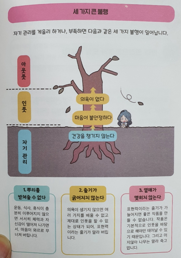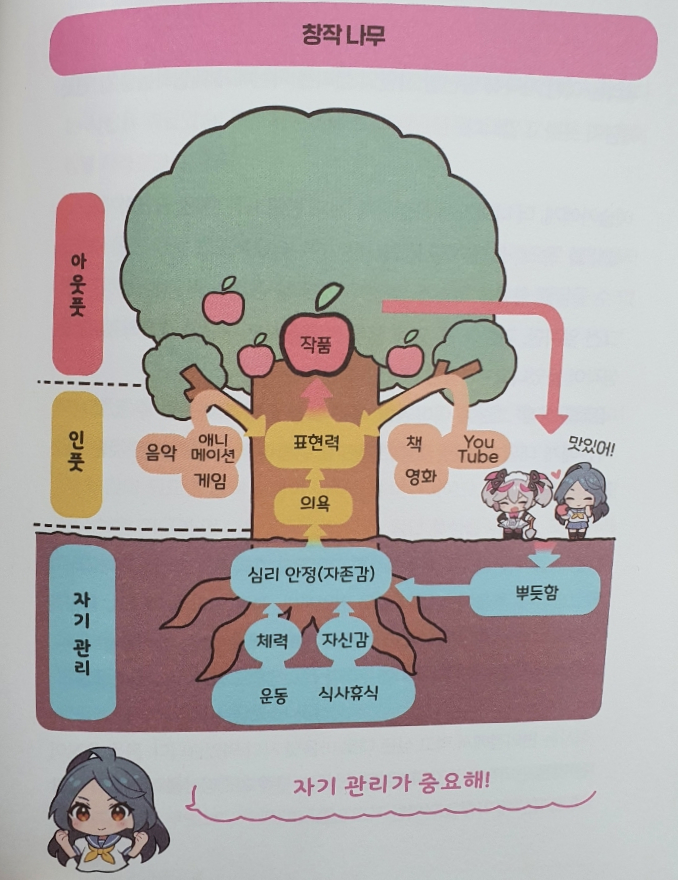 나무의 성장 그림과 창작 나무를 똑같은 구성으로 그려둔 일러스트도 인상깊었습니다. "자기관리", "인풋", "아웃풋" 구성으로 된 도식인데, 어떠한 토대에서 결과물인 열매, 즉 작품이 만들어지는지를 잘 다룬 그림이었습니다.
