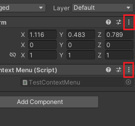유니티에서 컨텍스트 메뉴(ContextMenu) 는, 컴포넌트 이름 우측에 세로로 돌아간 ... 아이콘을 클릭했을...