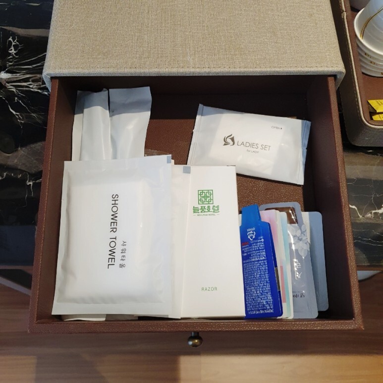 어메니티는 거의 풀패키지 수준. 치약, 칫솔, 샤워타올, 스킨, 로션, 면도기 등등... 전주 한옥마을 늘품호텔에 묵으면 개인 세면도구가 없어도 될 것 같습니다.