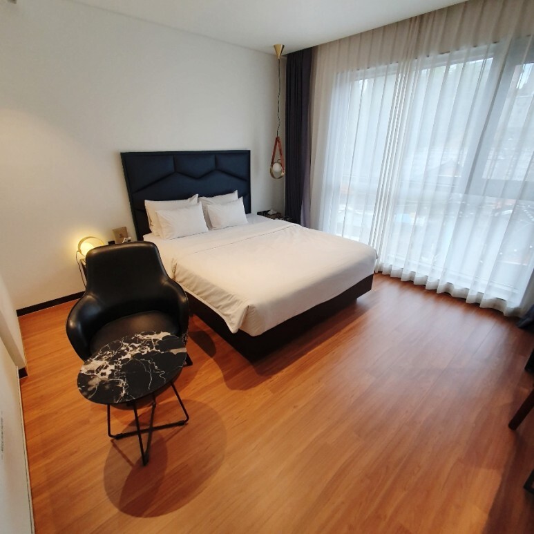 광각으로 촬영하긴 했지만, 캐리어나 짐 놔두고도 빈 공간이 많을 정도로 널찍했습니다. 침대는 퀸사이즈같고, 나무 프레임이라 소리가 약간 날 수는 있지만 거슬리진 않는 정도. 옆 창문이 통창이라 채광이 훌륭합니다.