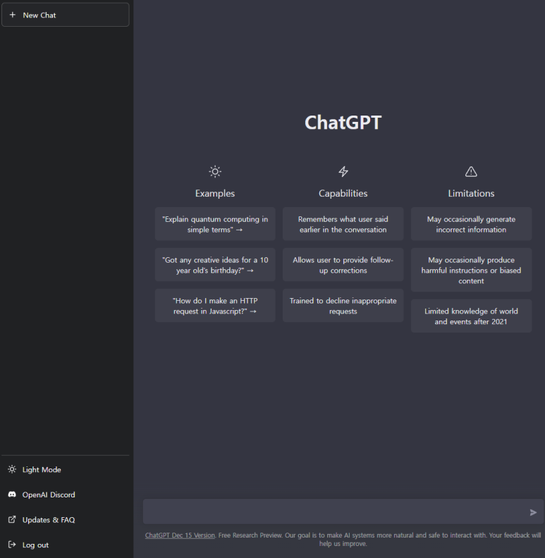 모두 마치면 ChatGPT 의 심플한 채팅창을 볼 수 있습니다.