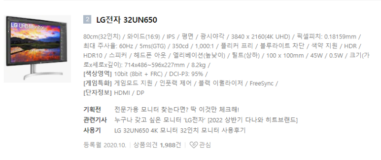 | LG 32인치 4K UHD 모니터 32UN650 게임과 그래픽 디자이너 작업용으로 구입 (0) | 2023.01.09 |