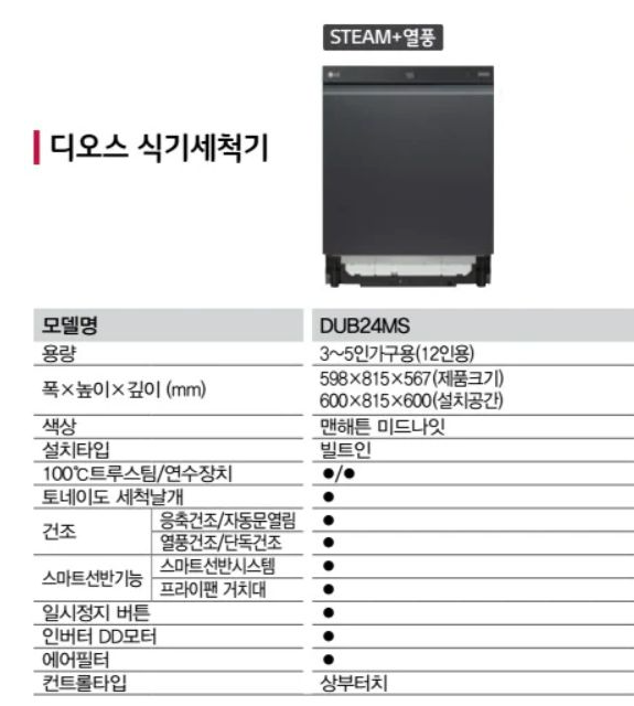 그러다보니 선택지가 딱 하나 남았어요. 컬러도 무난하게 어두운 색으로 해서 DUB24MS 모델. DFB24MS 모델은 중간에 모델명이 U 냐 F 냐만 다른데, F는 프리스탠딩 모델입니다. 저는 빌트인 모델이기 때문에 DUB24MS 식기세척기로 결정.