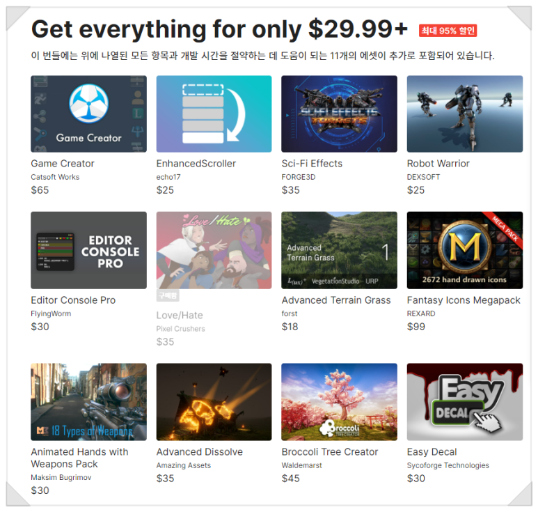 게임 개발 시간을 단축하기 위해 필요한 에셋들이지만, 무엇보다 중요한 건 정말 필요한 에셋들만 구입하는 것인데, 이런 메가 번들 세일은 가격 할인율이 어마어마해서 매번 고민되는 것 같습니다. 이번에도 할인 비율이 95% 정도로 너무 저렴하게 판매 중이라, 정작 필요할 것 같은 에셋은 몇 개 안 되지만, 그조차도 원가보다 저렴한 번들 가격이라 고민을 덜어주는 느낌입니다.