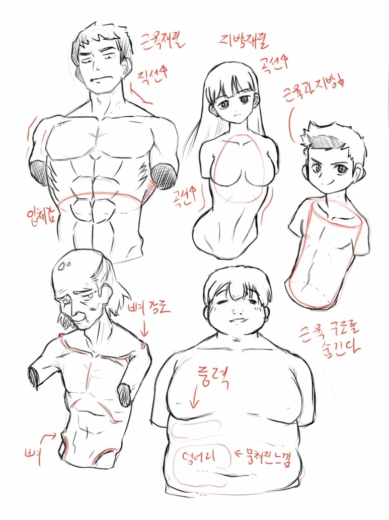 날씬한 여성 캐릭터는 지방이 상대적으로 많으니 곡선이 많이 보입니다. 흉곽은 계란모양으로 잡아줍니다.