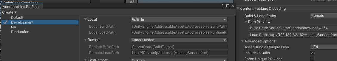 Addressables Groups 의 "Default Local Group" 은 로컬 콘텐츠 빌드 구성이나, 원격 콘텐츠 빌드 구성으로 변경하려면 아래와 같이 진행.