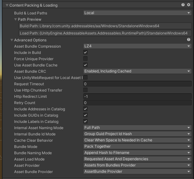 - 이 그룹의 에셋에 대한 에셋 로드 요청을 이행하기 위해 어드레서블 시스템이 사용하는 백엔드 전략.