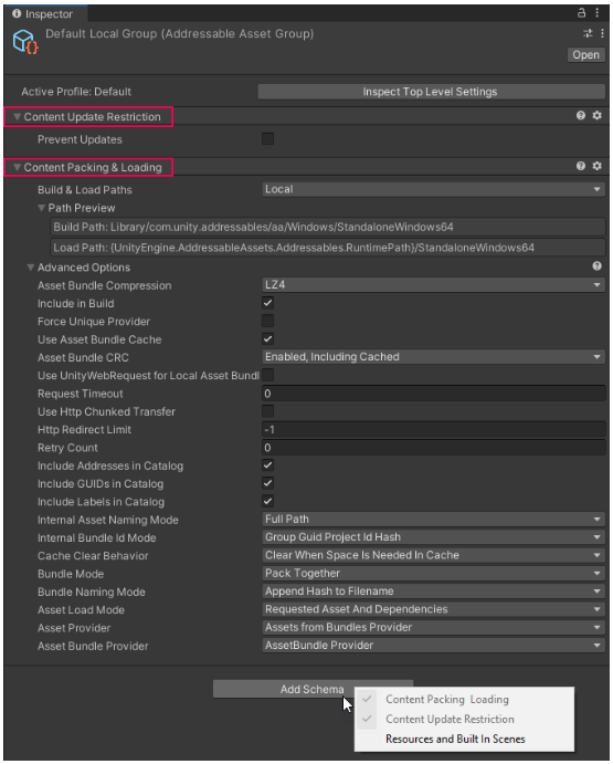 이 스키마는 빌드 스크립트에 이 그룹의 에셋을 Addressables 콘텐츠로 전환하는 방법과 애플리케이션이 콘텐츠를 읽는 방법을 알려주는 역할.