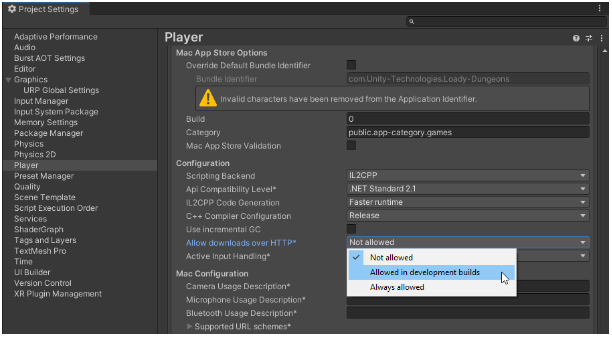 Edit > Project Settings > Player > Other Settings 하위에 아래 그림과 같이 "Allow downloads over HTTP" 체크박스가 있어야 하는데... 2021 버전 기준으로는 iOS 탭에선 보이는데 WIndows, Android 에서는 보이지 않음. 더 상위 버전으로 테스트 해볼 필요가 있음.