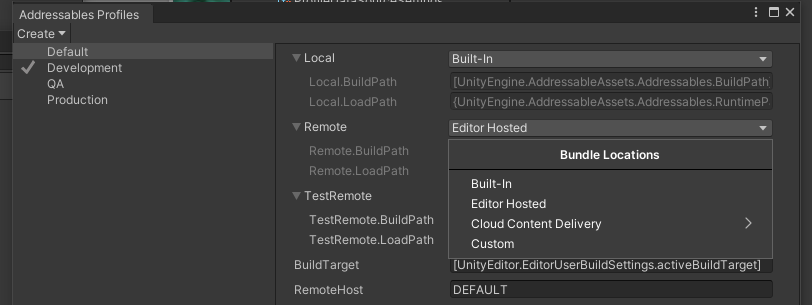 해당 클라이언트와 호환되는 번들을 빌드할 수 있도록 빌드 플랫폼을 일치하도록 설정. Addressables Profiles 창의 Remote 드롭다운 박스에서 Editor Hosted 확인.