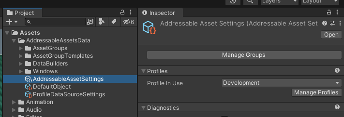 Window > Asset Management > Addressables > Settings 메뉴 선택. Project 폴더에서 AddressableAssetsData/AddressableAssetSettings 선택 시 Inspector 상태와 동일.