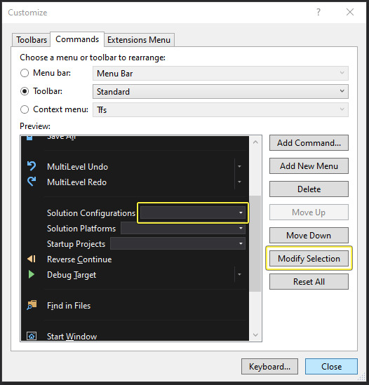 툴바 메뉴 Customize > Commands 탭 > Toolbar 라디오 버튼 > 드롭다운 메뉴 Standard 선택 > Preview 목록에서 Solution Configurations 컨트롤 선택 > Modify Selection 버튼 클릭.