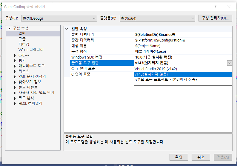 프로젝트 속성 > 일반 탭으로 이동. 플랫폼 도구 집합 드롭다운 받스를 눌러서 변경.