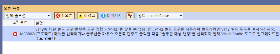 오류 MSB8020 v143에 대한 빌드 도구(플랫폼 도구 집합 = 'v143')를 찾을 수 없습니다. v143 빌드 도구를 사용하여 빌드하려면 v143 빌드 도구를 설치하십시오. [프로젝트] 메뉴를 선택하거나 솔루션을 마우스 오른쪽 단추로 클릭한 다음 "솔루션 대상 변경"을 선택하여 현재 Visual Studio 도구로 업그레이드할 수도 있습니다.