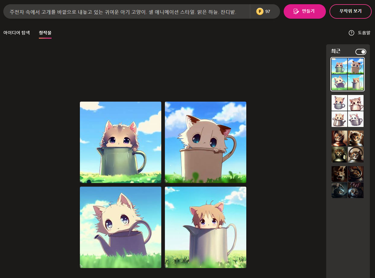 DALL-E 기반. 웹 베이스. 간단하게 프롬프트를 입력해서 이미지를 생성.