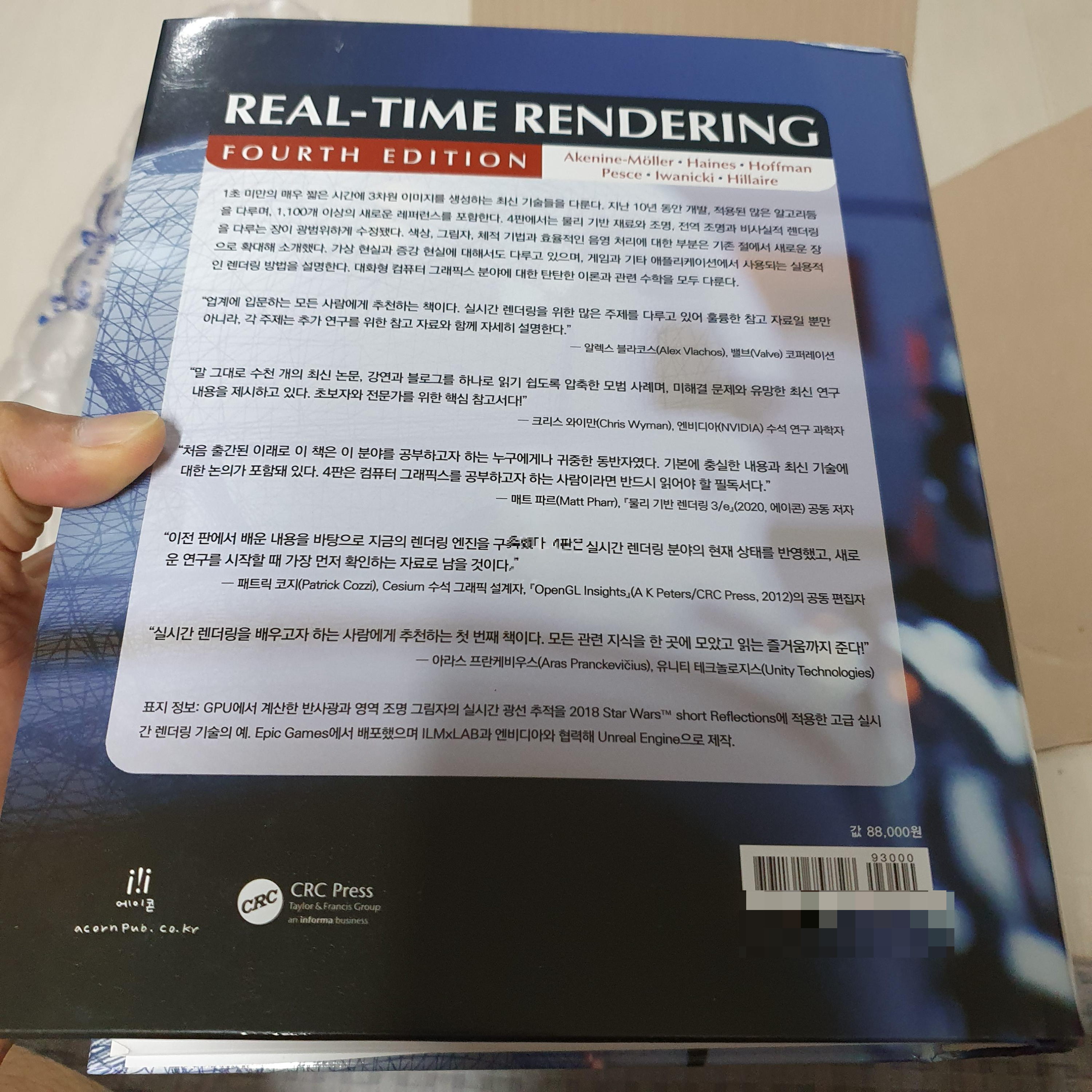 리얼-타임 렌더링 4판이 출간되었습니다. 실시간 렌더링에 대한 모든 것들을 담은 바이블. 오랜만에 나온 명서. 묵직한 분량에 하드커버까지.