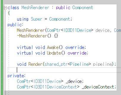 Game::Init() 함수에서 GameObject를 생성할 때 MeshRenderer를 추가해주면서 초기화 해주면, 이제 Rendering 관련 모든 처리는 MeshRenderer 가 할 수 있게 됨.