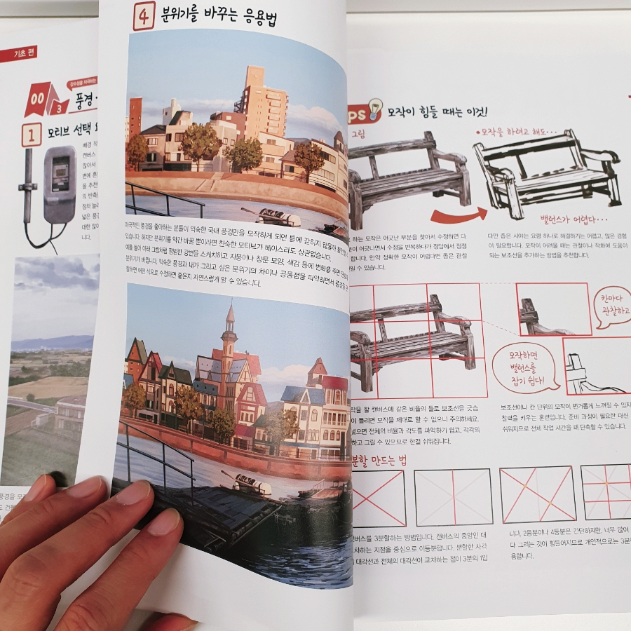 책의 구성은 크게 기초편과 실전편으로 나뉩니다. 기초편은 선과 색, 풍경/배경으로 구분해서 짧지만 핵심 원리들을 다루고 있어요. 선을 그을 때 저자가 중요하게 생각하는 것들을 샘플 그림들과 담백한 설명으로 옮겼습니다. 채색과 풍경/배경을 구성하고 그려내는 공통적인 핵심도 제일 처음 기초편에서 다룹니다.