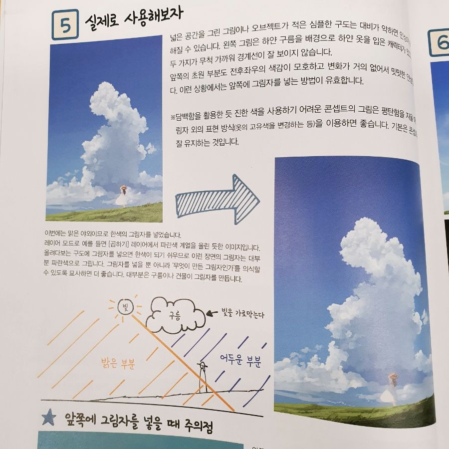 즉, 챕터에서 다루는 기본기들과 이론들을 앞에서 최대한 친절하고 상세하게 다룬 뒤, 이렇게 다룬 이론들을 총동원해서 하나의 일러스트를 완성하는 구성으로 하나의 챕터가 구성됩니다. 흐름 구성이 아주 교과서적입니다. 자칫 저자의 의식의 흐름대로 흘러갈 수 있는 구성을 짜임새 있게 잘 편집했습니다.