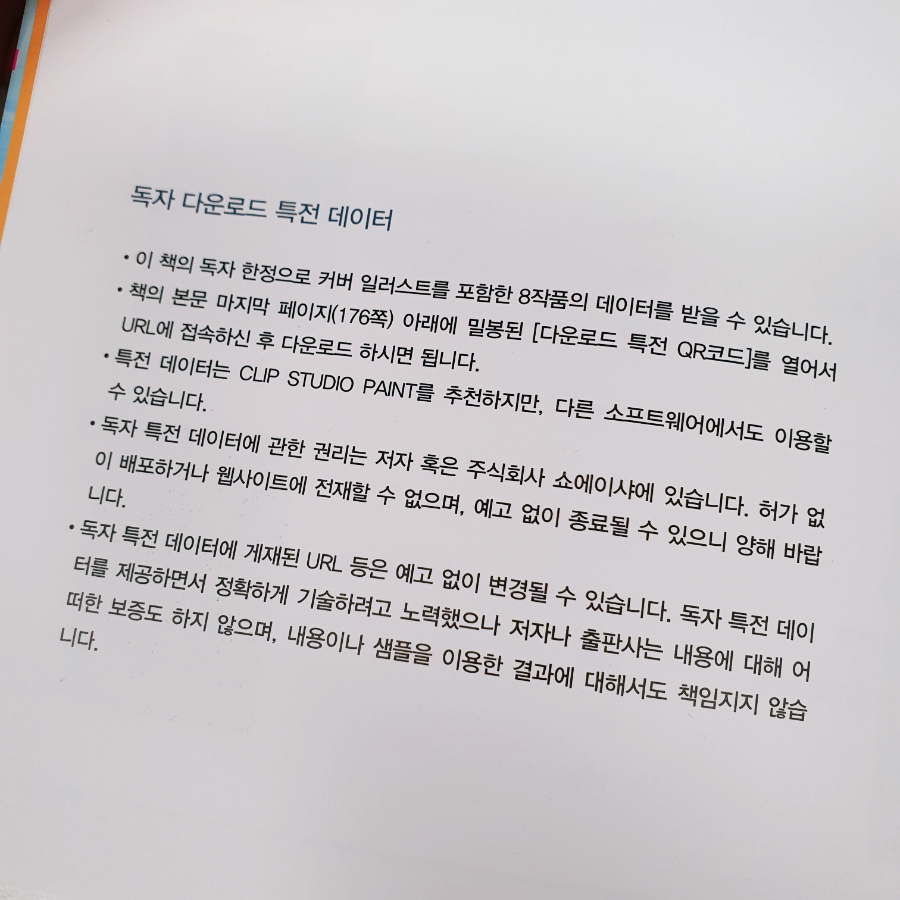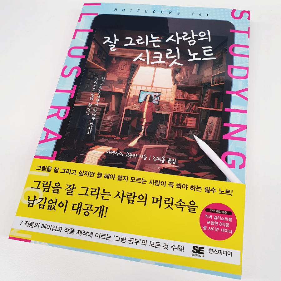 이 책 앞표지 뒤에는 QR 코드가 감춰져있습니다. <잘 그리는 사람의 시크릿 노트>책의 각 챕터에서(표지 포함) 완성해 보여주는 일러스트들의 풀사이즈 데이터를 내려받을 수 있습니다. 이 책에서 설명하는 다양한 이론과 표현들을 실제 일러스트 데이터를 직접 확대해서 관찰해 보는 것도 큰 도움이 될 것 같습니다.
