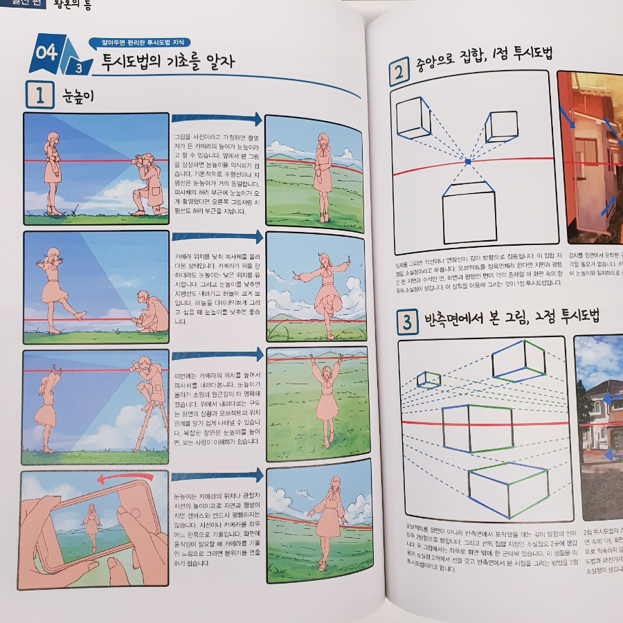 이렇게, 목차는 7개 일러스트를 완성하는 과정들만을 다룰 것처럼 구성돼있지만, 그 내용은 각각 독립적인 이론들과 지식들로 구성돼있고, 이런 기본기들이 실제로 어떻게 활용되고 조합되어 일러스트를 완성해 나가는지를 구조적으로 보여줍니다.