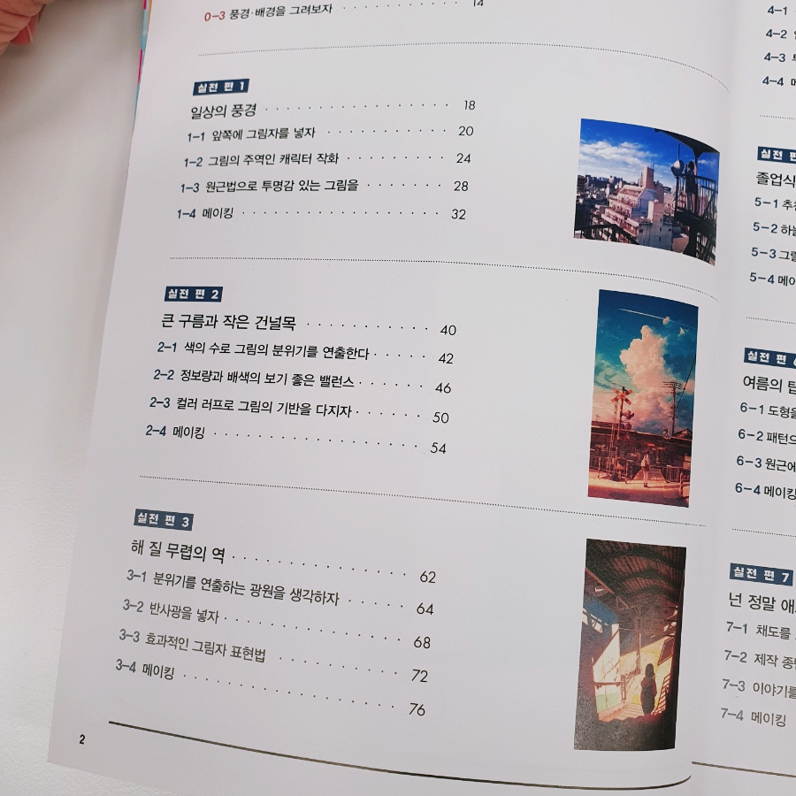 이렇게, 목차는 7개 일러스트를 완성하는 과정들만을 다룰 것처럼 구성돼있지만, 그 내용은 각각 독립적인 이론들과 지식들로 구성돼있고, 이런 기본기들이 실제로 어떻게 활용되고 조합되어 일러스트를 완성해 나가는지를 구조적으로 보여줍니다.