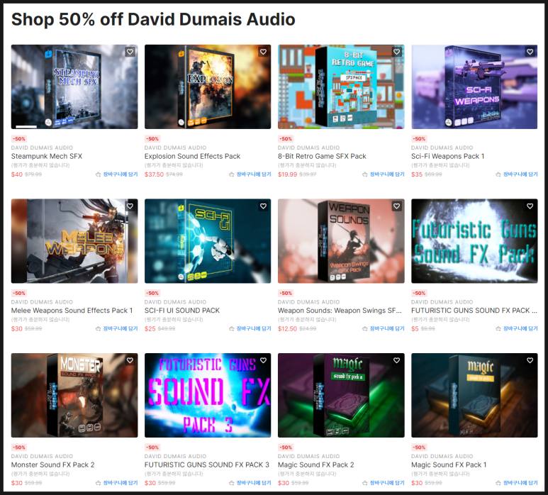 다음 주 목요일(2월 8일)까지 David Dumais Audio 의 다양한 에셋들을 유니티 에셋 스토어에서 50% 할인된 가격으로 구입할 수 있습니다.