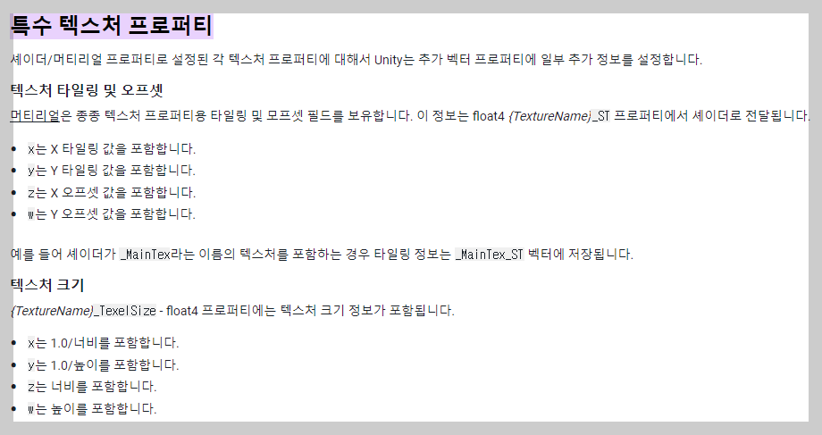 Unity 공식 문서, Cg/HLSL 셰이더 프로퍼티 액세스 - 특수 텍스처 프로퍼티