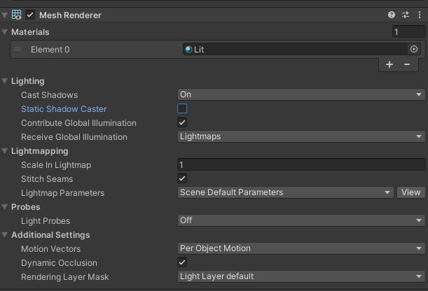 유니티 엔진에서 Mesh Renderer, Line Renderer 등 Renderer 를 상속받은 컴포넌트에 Static Shadow Caster 라는 플래그가 있다. Lighting 헤더 아래에 Cast Shadows, Contribute Global Illumination 사이에 떡 하니 (Cast Shadow를 On 으로 했을 때만 등장) 위치해 있어서 굉장히 중요해보이는 플래그인데,