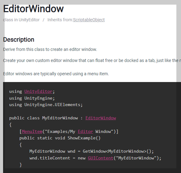 보통은 EditorWindow 를 상속받아서 유니티 엔진 내부에 커스텀 윈도우를 만들곤 하는데, EditorWindow 를 상속받아서 작업하게 되면 디테일하게 작업해줘야 할 코드가 꽤 많아진다.