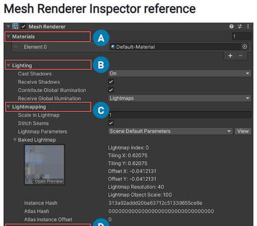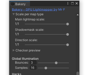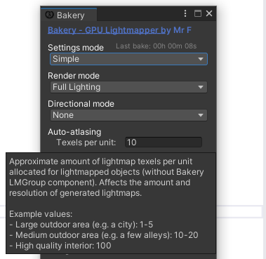 Texels per unit (단위당 텍셀)은 기본 해상도이지만 모든 오브젝트는 MeshRenderer의 "Scale in Lightmap" 옵션과 베이커리 창의 "Scale per map type" 을 사용하여 추가로 조정할 수 있다는 점에 유의하세요.
