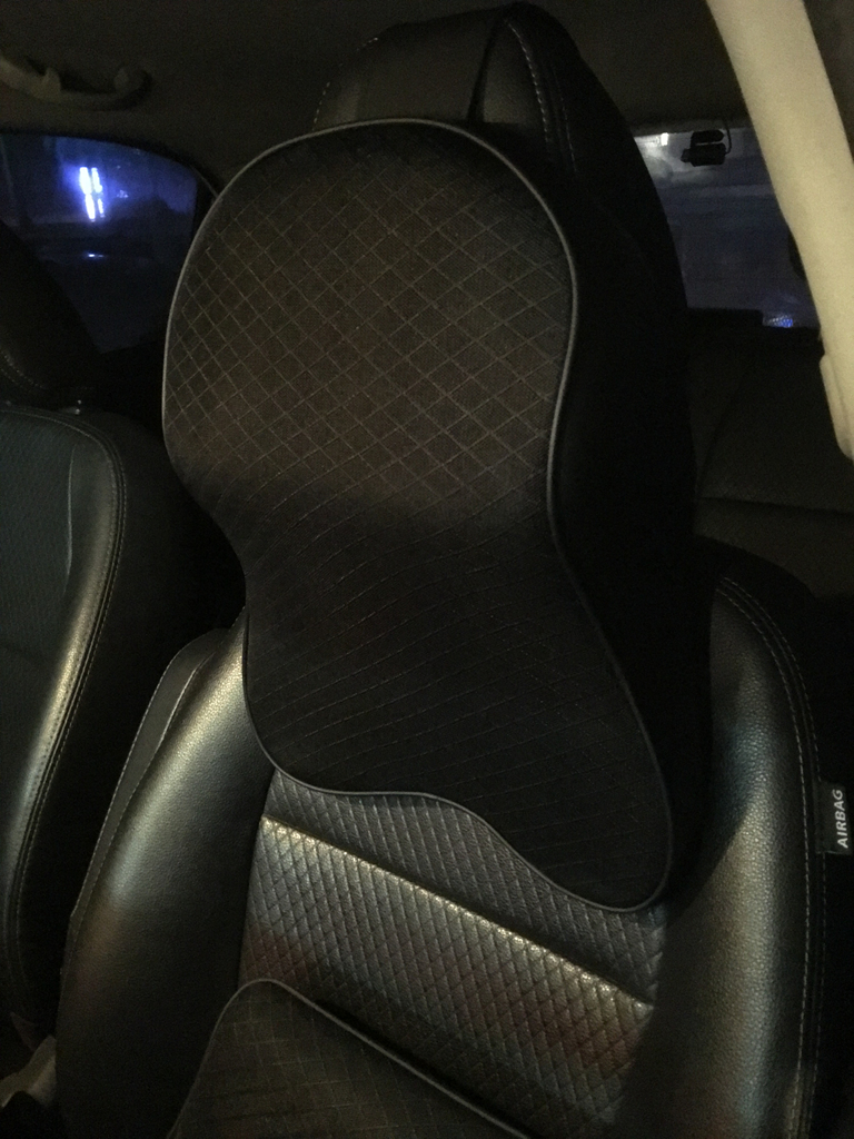 허리 쿠션(등 쿠션)은 이렇게 놓아두는 형태입니다. 고정되는 방식이 아니라서, 운전석에 앉으면서 쿠션이 잘 움직입니다. 앉을 때마다 위치를 잡아줘야 하는 불편함은 조금 있지만, 한 번 위치 잡으면 한두시간 운전하면서 불편한 감은 거의 없을 정도. 목쿠션이 부피가 있어서 허리쿠션도 같이 써줘야 자세가 잘 나옵니다. 등쿠션 없이 목쿠션만 쓰면 두께감 때문에 조금 불편할 것 같긴 하네요.
