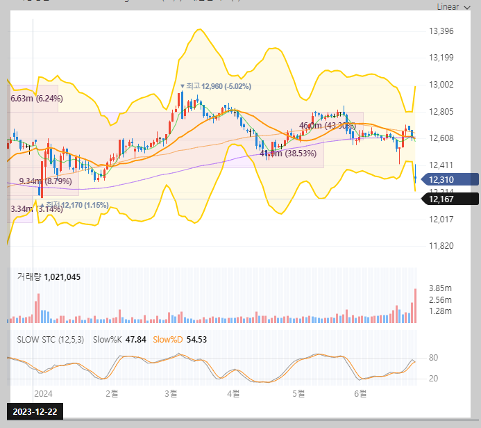 배당락의 영향인지, 배당금이 줄어들어 매력이 떨어졌기 때문인지, 낙폭이 꽤 컸습니다. 그런데, 지난 배당락인 12월 27일도 보면 크게 음봉을 만들었다는 걸 볼 수 있습니다. 2023년 6월 29일도 낙폭이 컸던 걸 보면 어느 정도 패턴이 있다는 의미이기도 합니다.