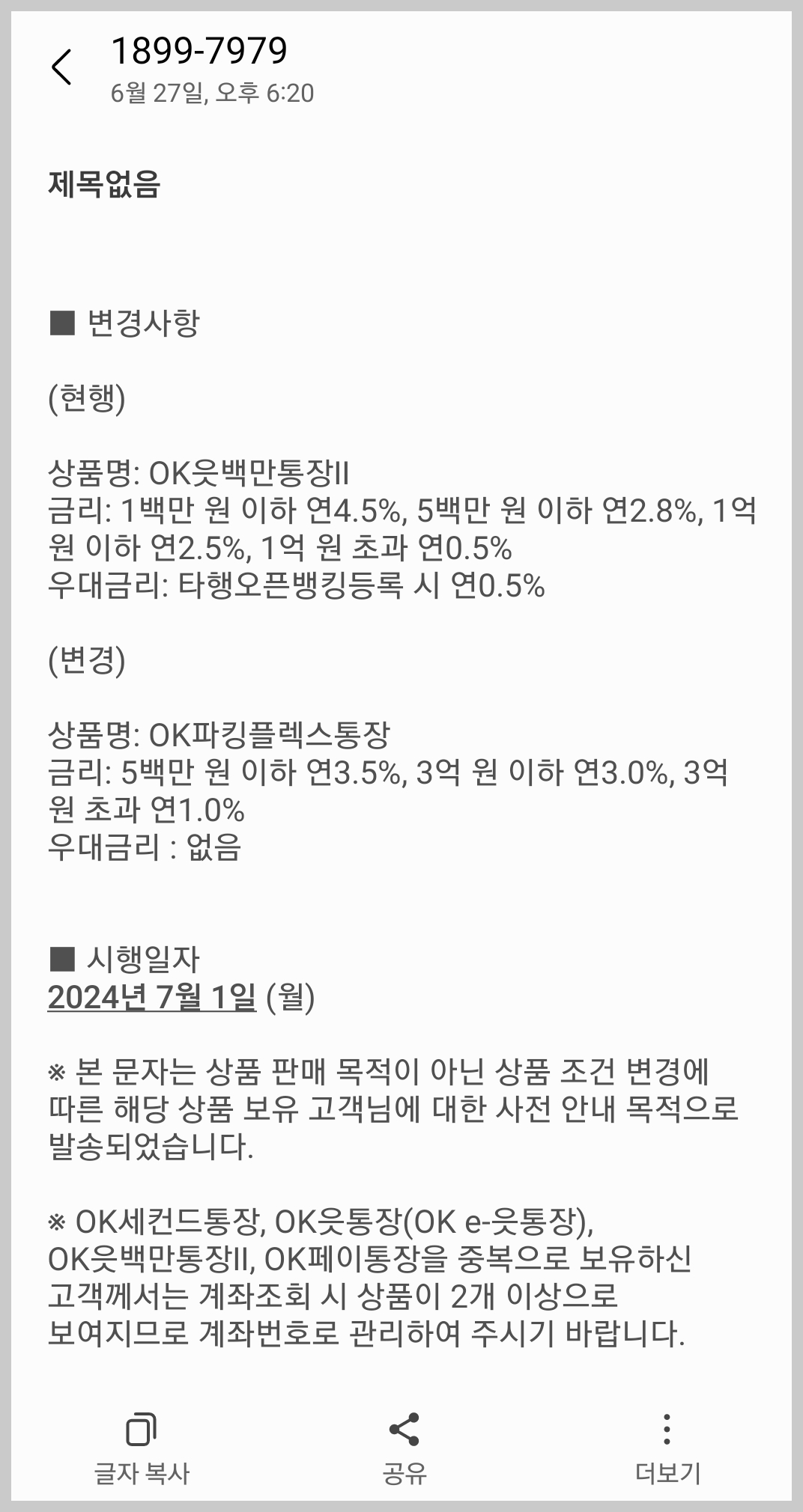 그런데, 어제, 6월 27일 목요일, 갑자기 문자가 한 통 날아왔습니다. OK읏백만통장II 가 아예 다른 계좌로 변경이 된다는 것.