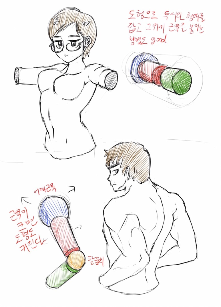 팔을 도형화 시켜 그리는 방법에 대해 그렸습니다. 도형화를 통해 팔의 투시와 근육의 부피를 대략적으로 구도를 잡을 수 있습니다.
