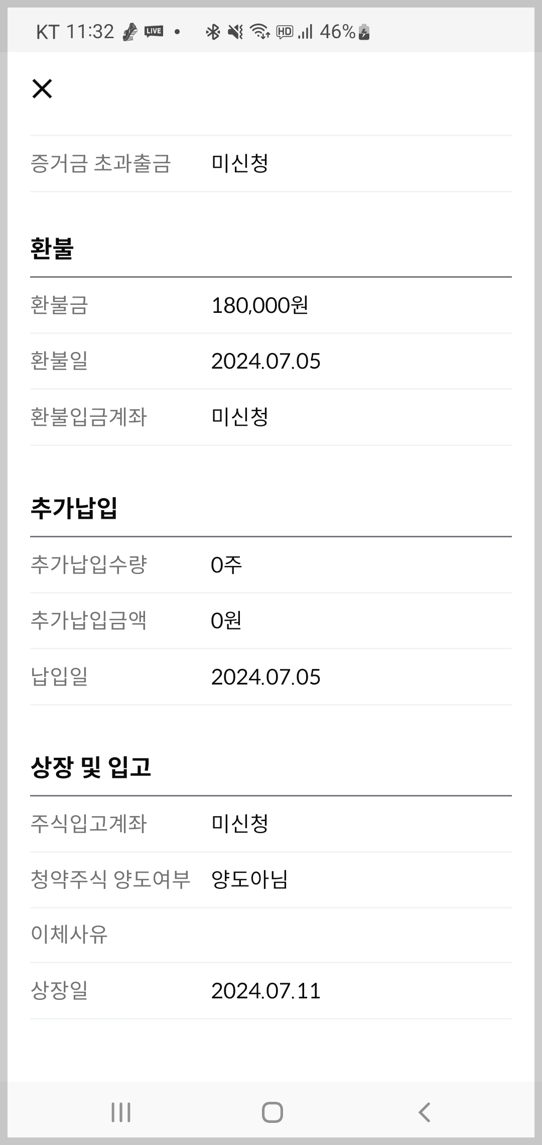 아무튼, 공모가 6만원짜리 주식 2주를 배정 받아서 증거금 30만원 중 12만원을 지불하고 18만원은 환급을 받게 됐습니다. 환급은 오늘인 7월 5일에 입금을 해준다고 합니다.