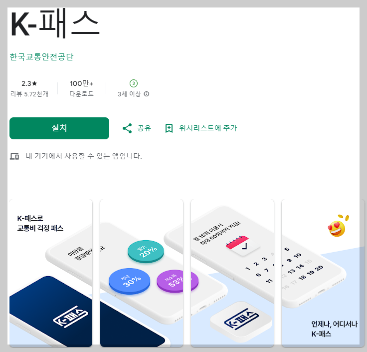 그리고 K패스 앱을 설치해줍니다. 역시나 공공 앱은 평점이 높지 않습니다. 핵심 기능만 잘 동작한다면 제가 별점을 깎을 일은 없을 것 같습니다. 제발.