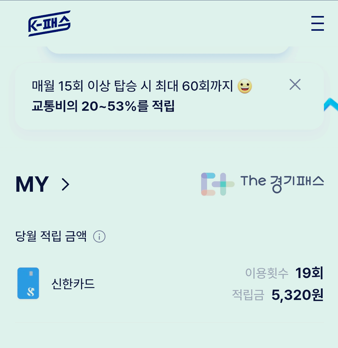 K패스 앱을 설치하고, 가입하고, 카드까지 등록해줍니다. 그러면 당원 적립 금액과 이용횟수 등을 확인할 수 있습니다. 얼마 전에 찍은 스샷 상으로는 19회에 적립금 5329원 찍혔네요. 제법 되는군요. 5329원이면 출퇴근 몇번 더 할 수 있다. 와.