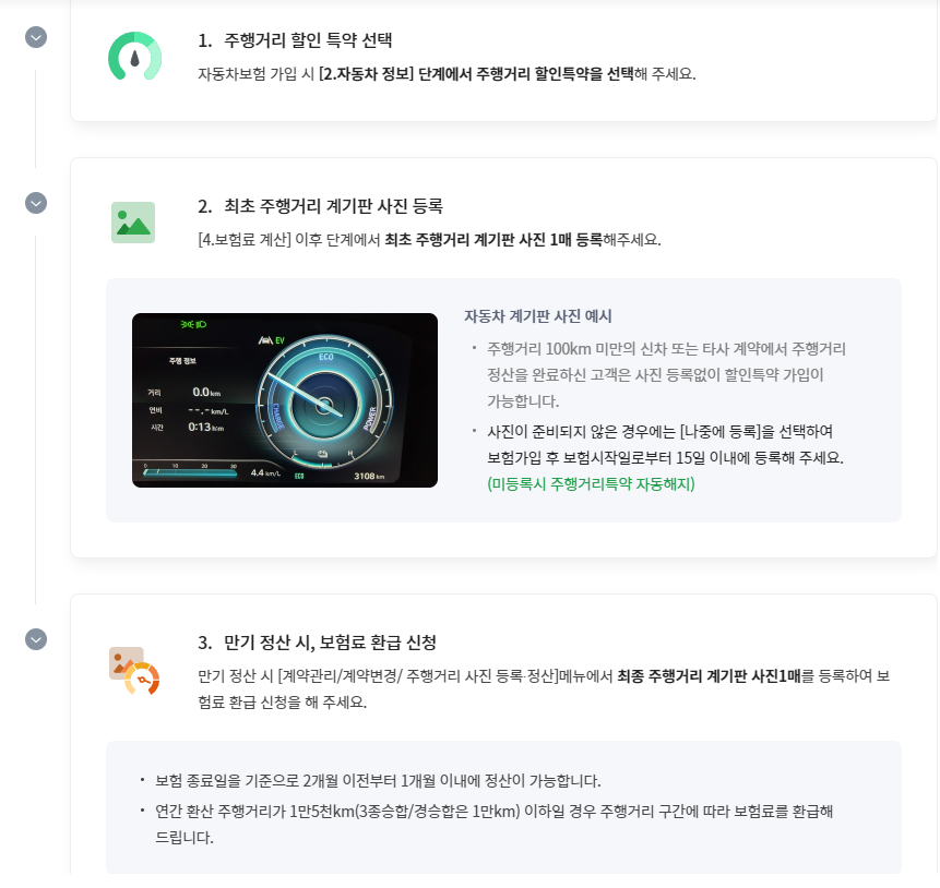 (최종 주행거리 계기판 사진 1매 등록 후 보험료 환급 신청. 보험 종료일 기준 2개월 이전부터 1개월 이내에 정산 가능.)