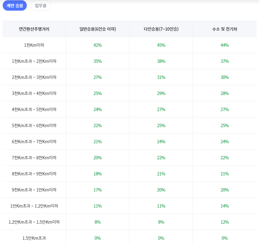 아래는 DB 다이렉트 주행거리 특약 할인 표. 다른 보험사는 거리와 할인율이 다를 수 있습니다.