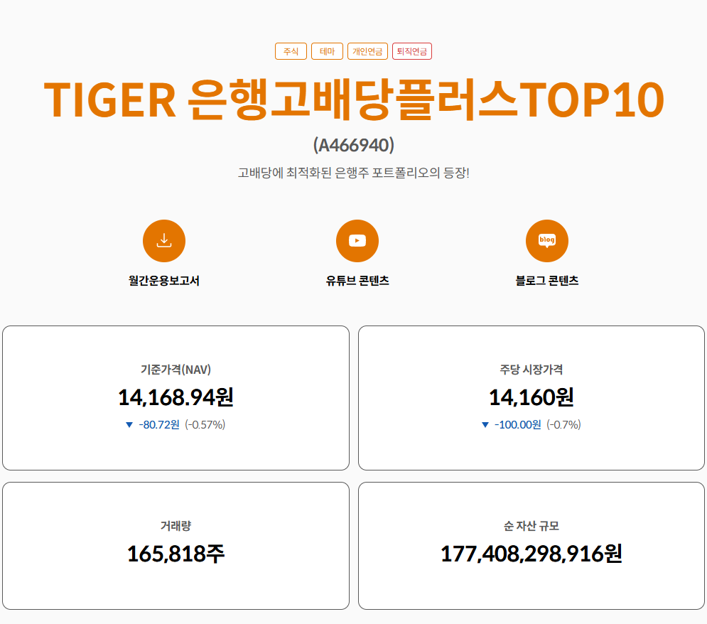 [ETF] TIGER 은행고배당플러스TOP10 (A466940) - 은행주 월배당