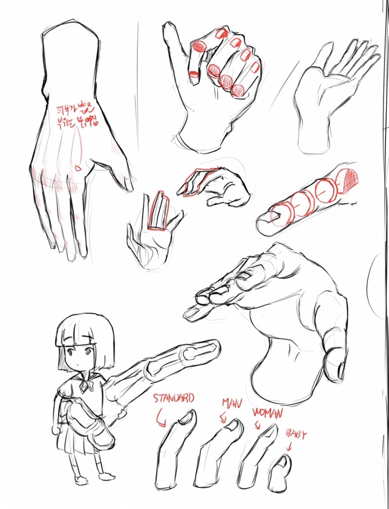 캐릭터의 성별이나 나이 등 특징에 맞는 손가락의 실루엣 디자인을 잡아주면 좀 더 자연스럽습니다.