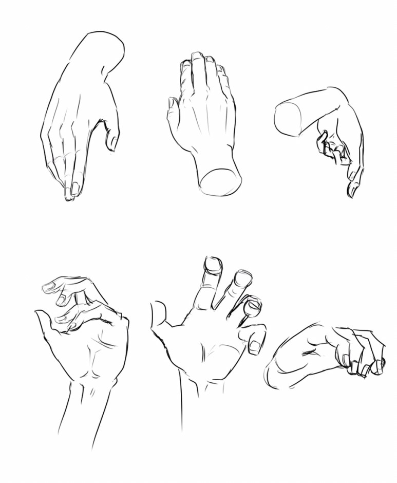 앞서 다뤘던 손 그리는 방법과 순서를 응용해서 다양한 포즈의 손을 그려봅니다. 최대한 많은 손 포즈를 참고해서 그려보는 것이 좋습니다.