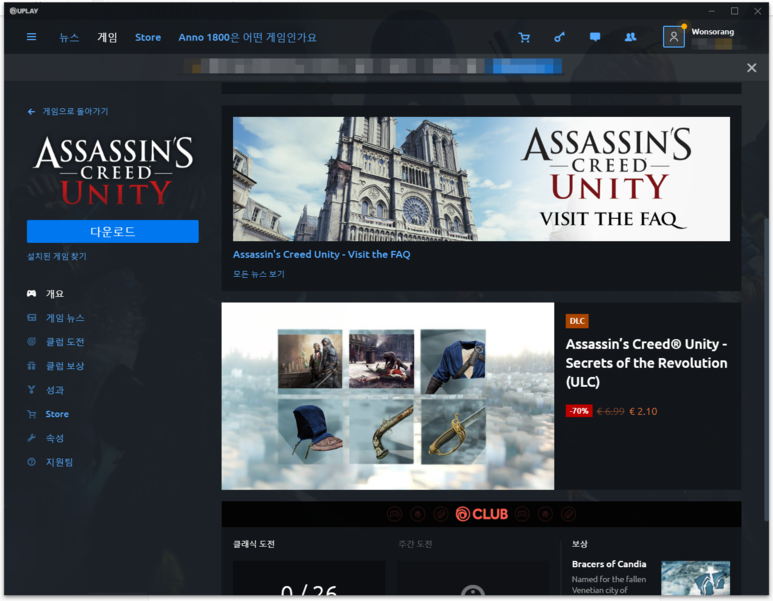 Uplay 가 설치되어있지 않다면, Download Uplay 버튼을 클릭해서 설치해줍니다. Uplay 를 실행하면 "게임" 탭에서 ASSASSIN'S CREED UNITY 를 찾아 설치하시면 됩니다.