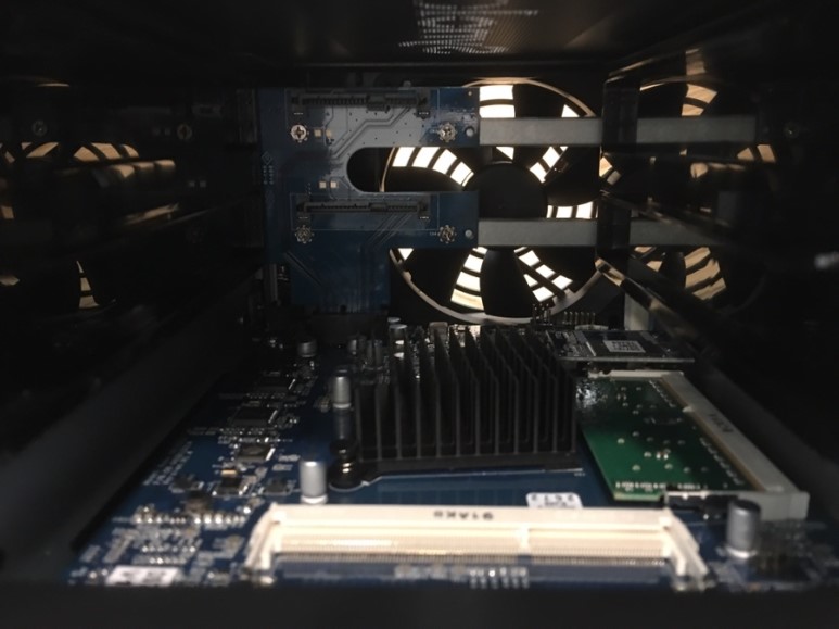 하드디스크랙을 모두 제거했을 때의 내부 모습입니다. 하단에 방열판과 램 슬롯이 보입니다. 나중에 램 업글도 고려 중입니다.