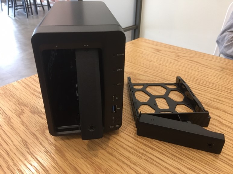 본체샷. DS718+ 이쁩니다. DS218+ 와의 큰 차이점은, 전면부에 하드디스크랙이 바로 드러나 보인다는 점. 디자인적으로는 더 맘에 드는데, 먼지 끼는 건 어쩔 수 없겠죠.
