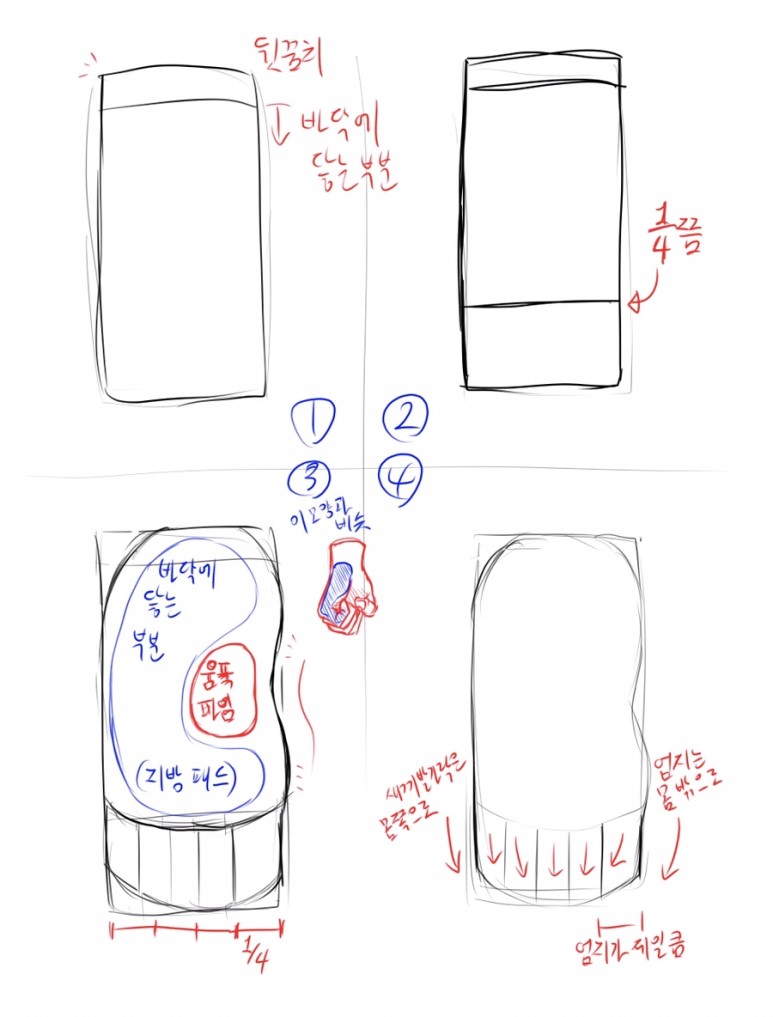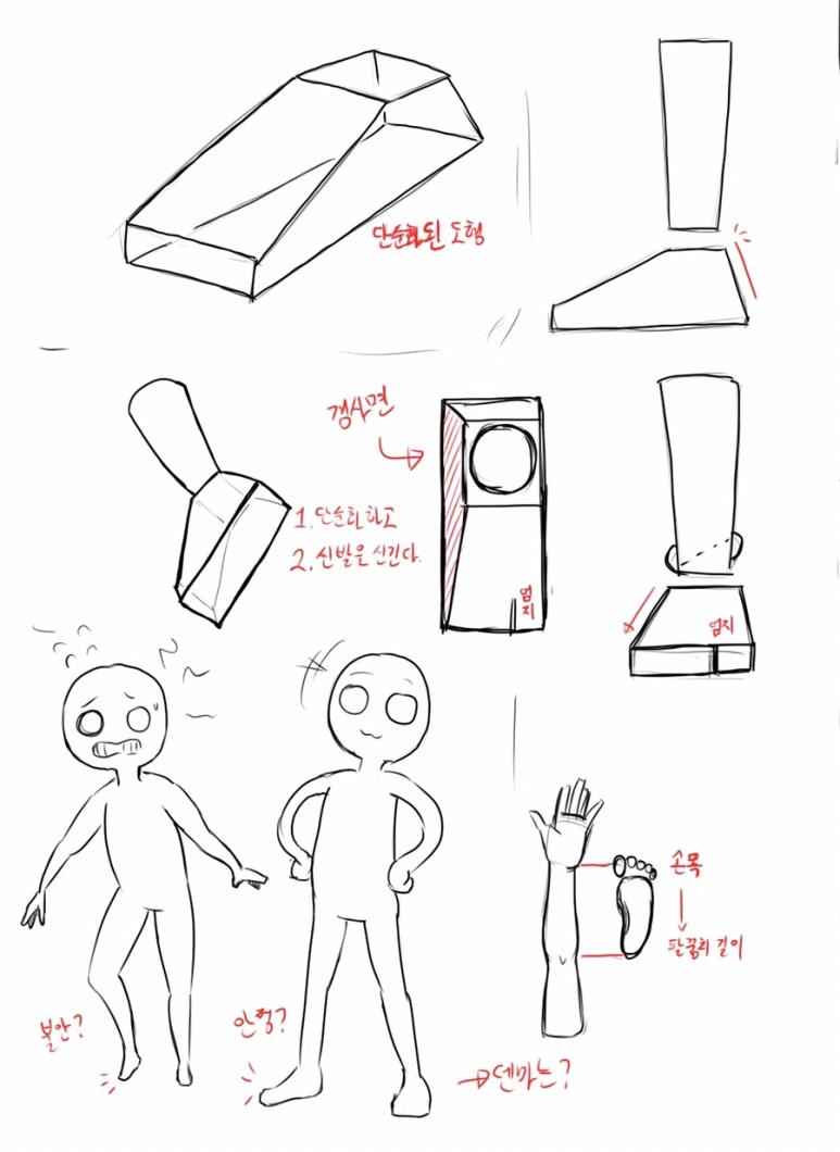 발 그리는 방법에 대해 그렸습니다. 단순화한 도형은 빗변을 가진 사다리꼴. 이 모양을 기준으로 신발은 신기거나 세부 묘사를 들어갑니다.